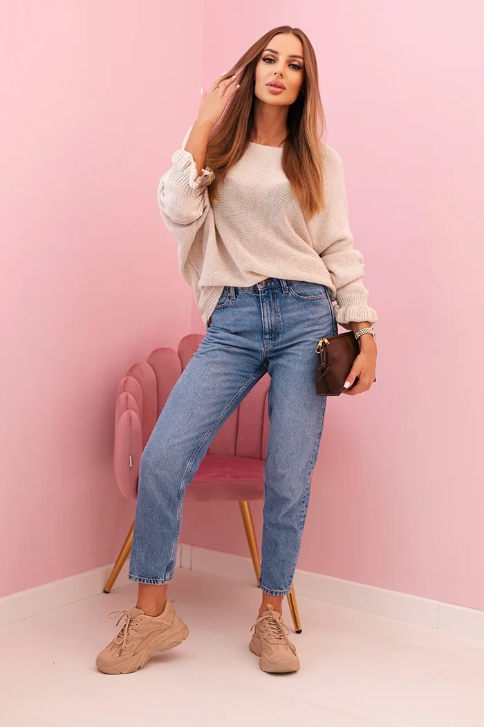 This unique women's sweater is the perfect combination of elegance and everyday comfort. Made from a blend of high-quality wool, mohair, and acrylic, it provides warmth and a pleasant wearing experience even on cooler days. The loose fit with drop sleeves ensures freedom of movement, while the decorative ruching on the cuffs adds a subtle charm to the overall design.
