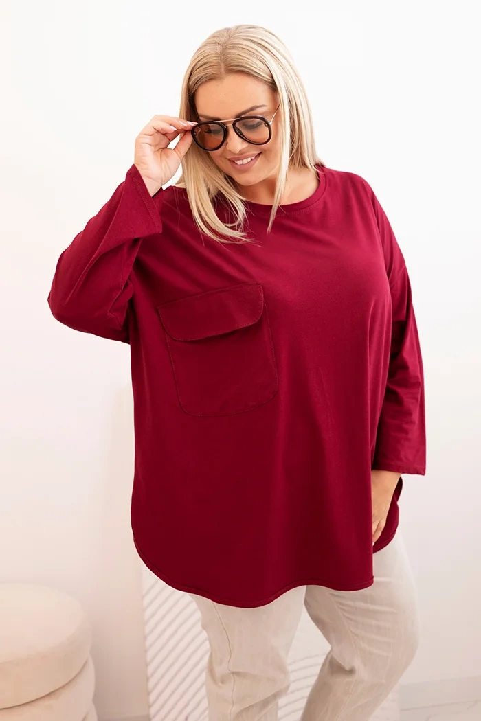 Plus Size women's blouse with cotton, featuring a pocket and rolled-up sleeves burgundy