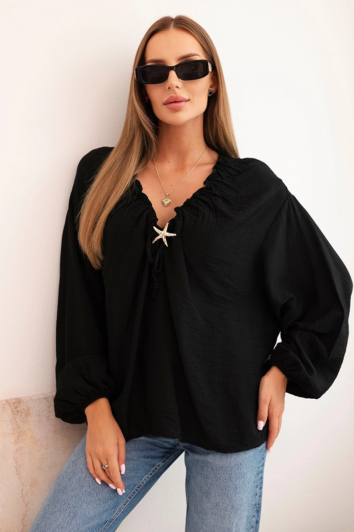 This women's blouse with viscose is a combination of comfort and feminine style. Made from lightweight, breathable fabric, it is perfect for both everyday wear and social gatherings. The gathered neckline with adjustable ties and a star-shaped decorative pendant attracts attention and adds a unique character.