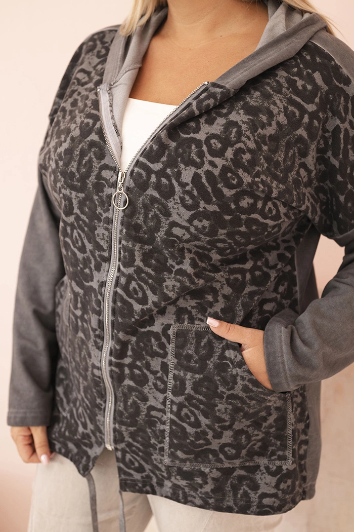 Trendy Plus Size women's hoodie with a distressed effect and leopard print combines comfort with modern style. Zip-up, with a large hood and practical pockets, fits perfectly into casual, everyday outfits. The characteristic leopard pattern and drawstrings at the bottom add a fashionable edge.