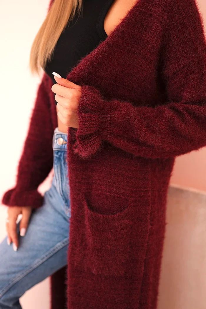 Stylish and cozy women's mohair cardigan, perfect for cooler days. Made from a blend of mohair, wool, and acrylic, it provides excellent thermal properties while being lightweight and soft to the touch. The model features long sleeves, an open front, and practical pockets. The long cut visually slims the silhouette and looks great both with pants and dresses.