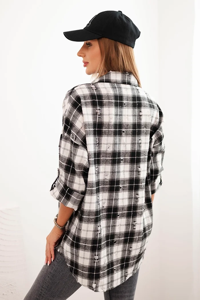 The shirt features a classic collar, button closure, and a chest pocket. The trendy distressed effect catches the eye, adding character and a modern style. The looser fit ensures freedom of movement, while the elongated back makes it look great with both jeans and leggings.