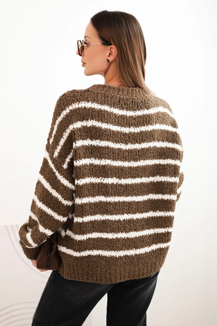 This women's striped sweater is the perfect choice for cooler days! Made from a pleasant-to-touch, soft knit, it provides not only warmth but also exceptional comfort. The loose fit with a slightly dropped shoulder line drapes beautifully on the silhouette, giving the outfit a relaxed, fashionable character. The classic horizontal stripe pattern makes the sweater suitable for both jeans and elegant trousers or skirts.