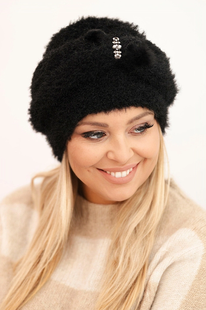 The hat is adorned with an elegant decorative element featuring shiny stones and delicate, furry pom-poms that add charm and a fashionable character.