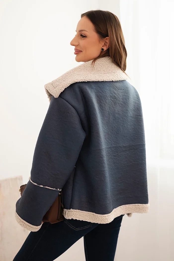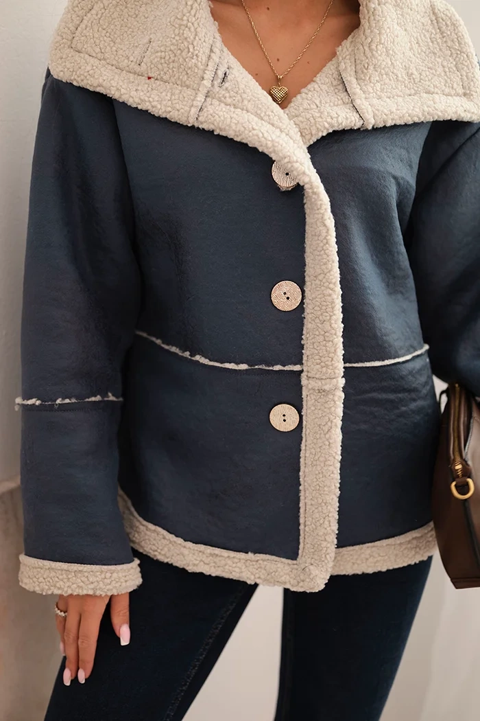 Plus size women's jacket with a shearling effect is the perfect choice for chilly days for women who value comfort and style. Soft to the touch, insulated on the inside with pleasant shearling, it works perfectly in everyday outfits. The classic button-up design with a wide collar and contrasting finish makes the jacket look fashionable and feminine.
