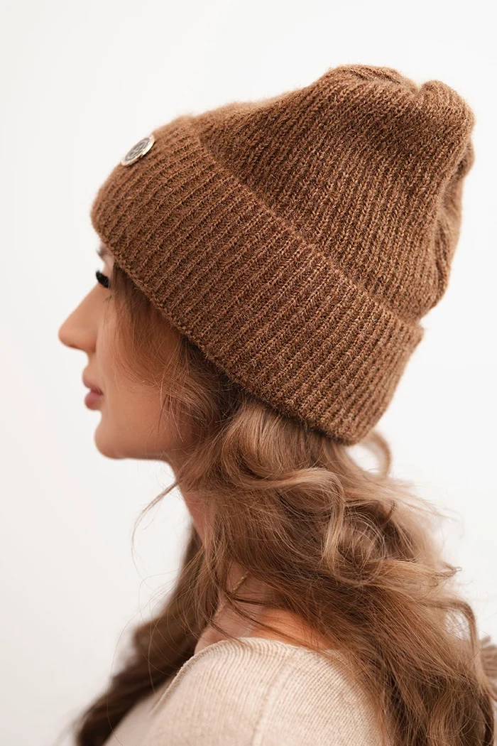 The model is adorned with a gold button at the front, adding elegance and distinguishing it from classic hats. The delicate, solid color scheme makes the hat suitable for many winter outfits – both casual and more elegant.