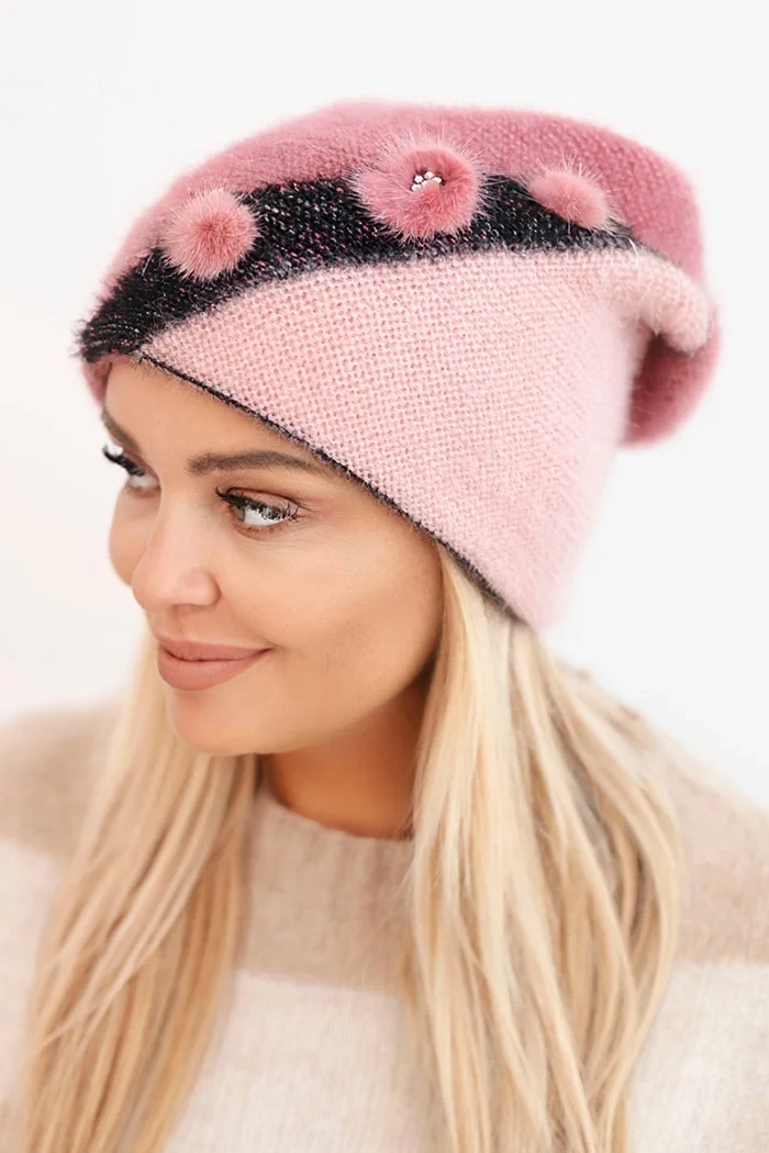 Elegant women's hat with fur decorations and a glittery band dark pink