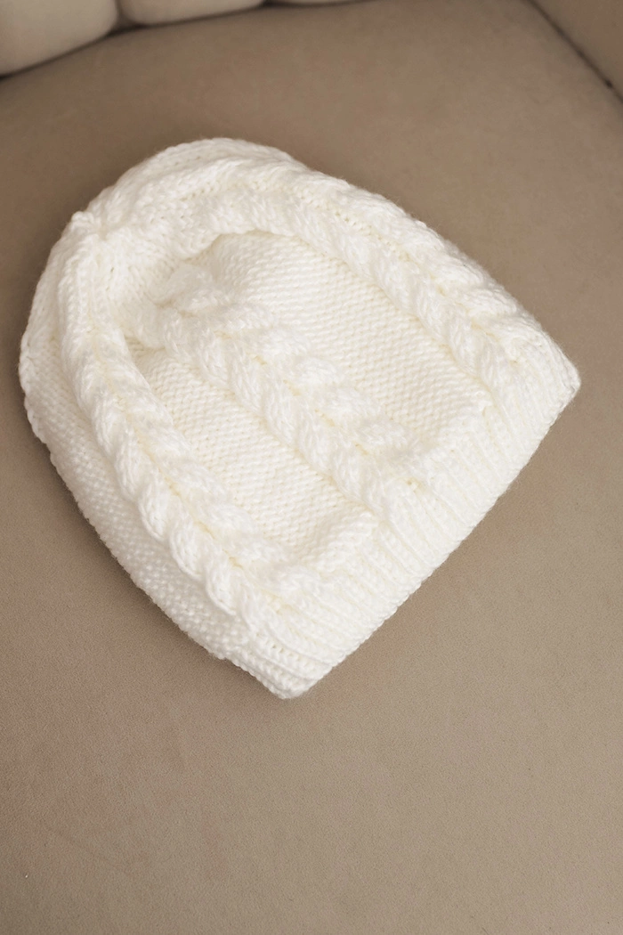 Stylish women's hat made of warm, soft knit fabric with a classic cable knit pattern. It fits the head perfectly, providing comfort and protection against the cold. Perfect for everyday wear and winter styling.
