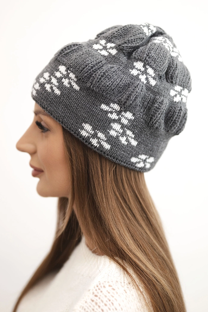 Stylish women's hat made of soft and pleasant-to-touch acrylic knitwear. It has a classic cut and a decorative winter snowflake motif. It is perfect for everyday wear on chilly days, providing comfort and warmth.
