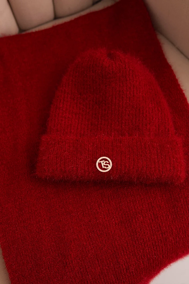 Women's set with a hat and scarf made of soft knit red