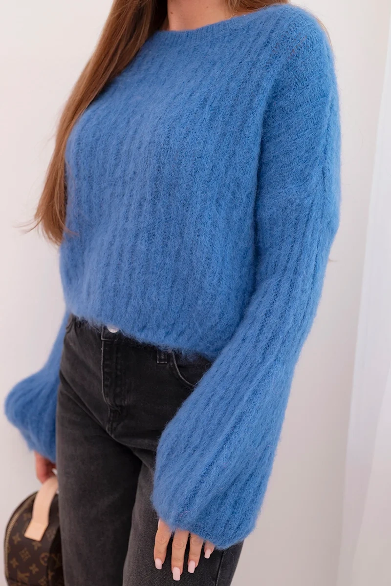 Stylish women's sweater made of a soft mohair blend is an ideal choice for cooler days. With its fluffy texture and loose fit, it works great both in everyday outfits and more elegant combinations. The puffed sleeves add a feminine charm and give it a trendy character. This Italian sweater is not only comfortable but also a statement of good style.