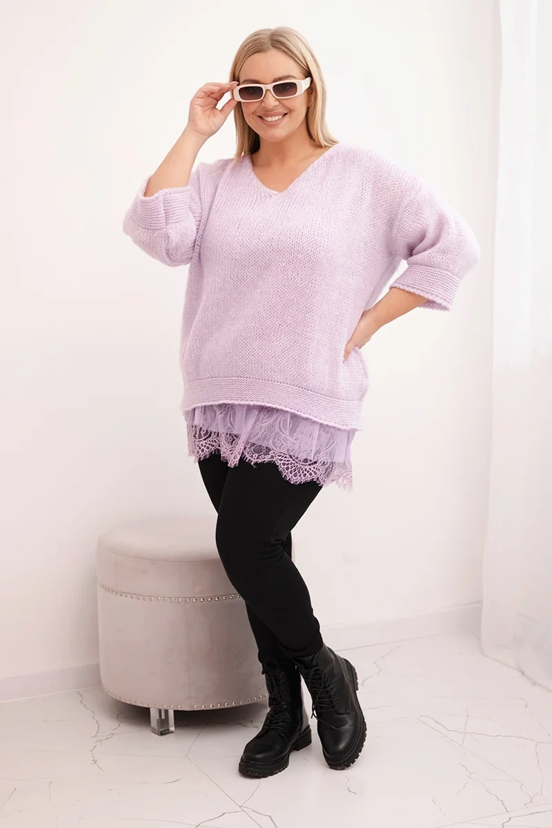 Women's set with a V-neck sweater and a viscose blouse with a lace bottom light purple