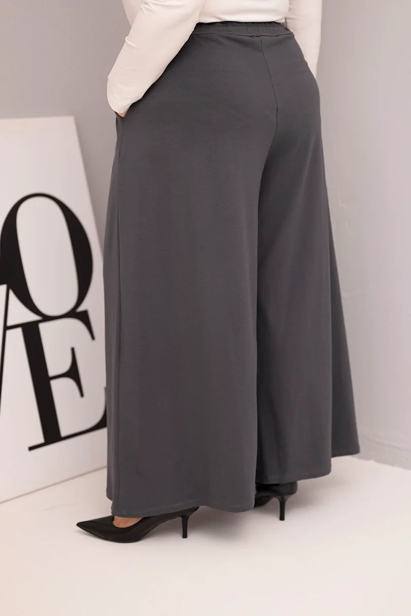 Stylish and extremely comfortable women's Plus Size pants with wide, flowy legs are the perfect choice for ladies who value comfort and a trendy, slightly oversized style. Thanks to the very wide cut, the pants beautifully drape during movement, creating a maxi skirt effect, while the elastic waistband ensures a perfect fit without pressure.