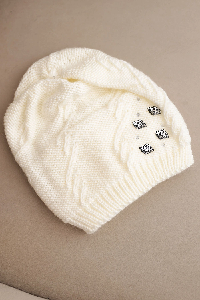 The model features subtle decorations – shiny appliqués and decorative weaving, which add charm and a feminine character. The elastic cuff fits snugly to the head, ensuring comfortable wear without pressure. An ideal choice for both everyday wear and more elegant winter outfits.