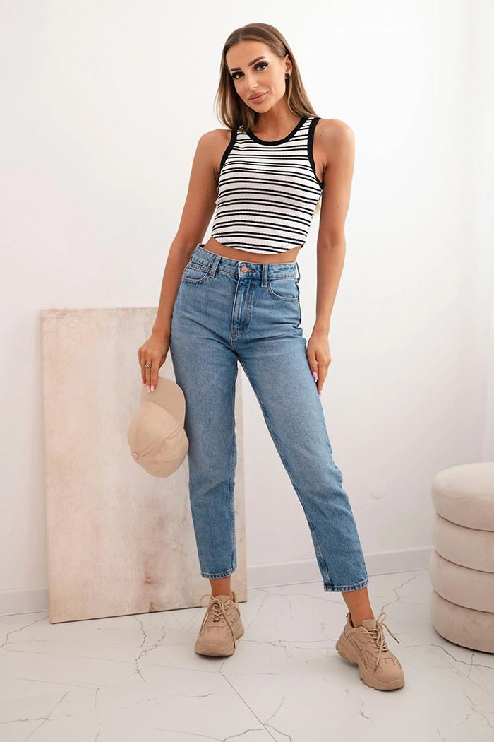 Stylish women's top with a shorter cut, made of stretchy, ribbed cotton with contrasting finishing at the neckline and shoulders. The model perfectly fits the silhouette, accentuating the figure while providing high comfort of wear. The classic striped pattern makes the top timeless and easy to style.