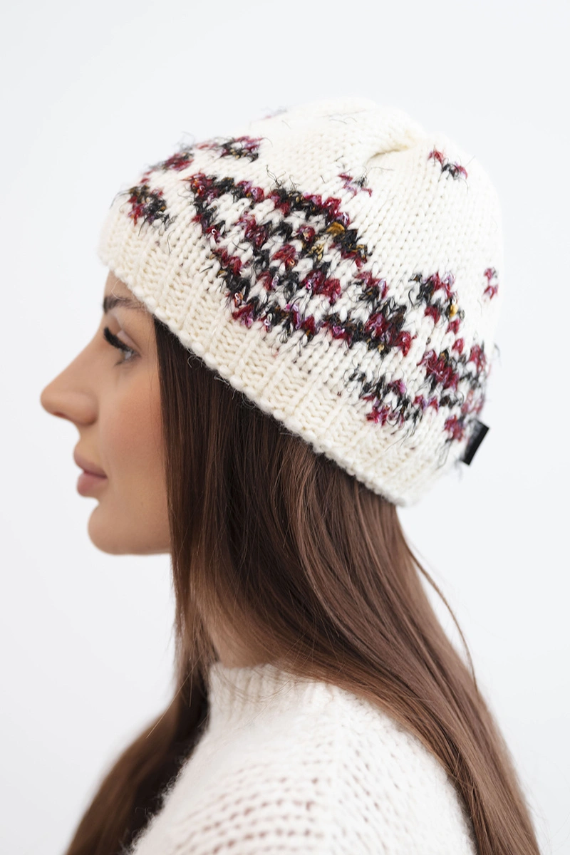 Women's winter hat with Norwegian pattern and thick weave K351 ecru + red