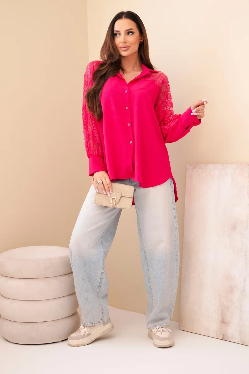 Stylish women's shirt with an elegant collar and subtle button fastening is the perfect choice for women who value class and comfort in their everyday wardrobe. The model is distinguished by eye-catching lace sleeves and shoulders, which give the whole a unique character. The loose fit ensures freedom of movement and comfort throughout the day.