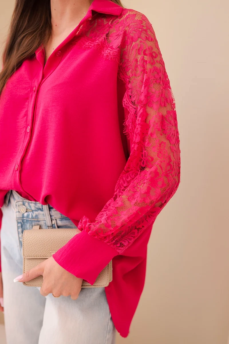 Stylish women's shirt with an elegant collar and subtle button fastening is the perfect choice for women who value class and comfort in their everyday wardrobe. The model is distinguished by eye-catching lace sleeves and shoulders, which give the whole a unique character. The loose fit ensures freedom of movement and comfort throughout the day.
