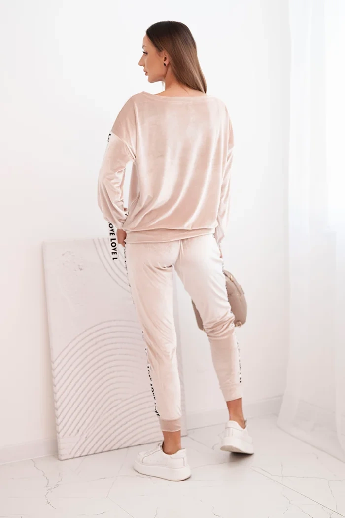 Wir präsentieren Ihnen ein Set aus Sweatshirt und Hose. Set aus Velours. Sweatshirt mit Bändern mit dem Wort Love. Hose mit Taschen und Bindeband. Sehr modisches und stilvolles Set. Das Set ist aus hochwertigem Material gefertigt. Die Größe ist universell und passt Damen der Größe S, M oder L.