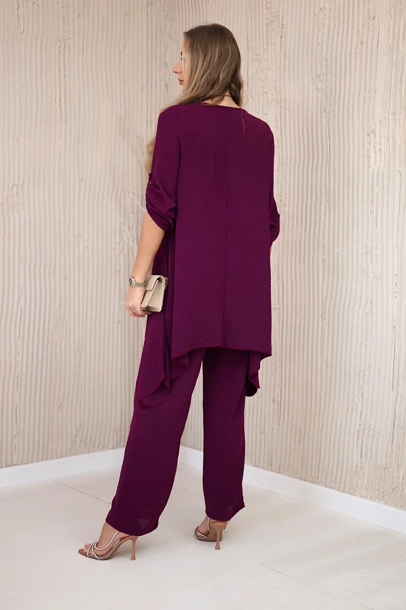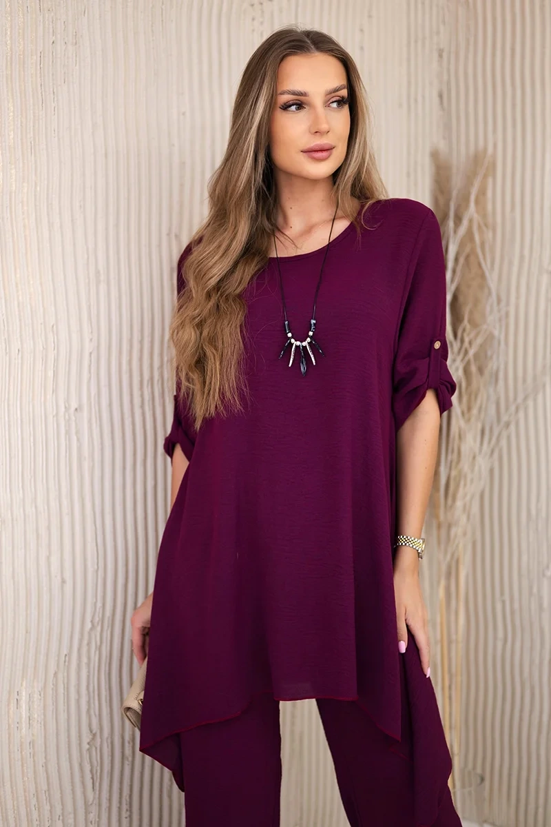 Ein italienisches zweiteiliges Set, bestehend aus einer ausgestellten Bluse und einer Hose, ist ein elegantes Set, das jedem Styling Charme und Stil verleiht. Eine ausgestellte Bluse verleiht dezente Weiblichkeit, betont die Figur und sorgt gleichzeitig für Bewegungsfreiheit. Durch den klassischen Schnitt der Hose passt sie perfekt zu einer eleganten Bluse und ergibt ein stimmiges und stilvolles Ganzes. Darüber hinaus ist der schlüsselförmige Anhänger ein charmantes Detail, das diesem Set Originalität und Charakter verleiht und eine harmonische Komposition schafft. Es handelt sich um ein elegantes Accessoire, das die Einzigartigkeit und Liebe zum Detail des gesamten Stylings unterstreicht. Dieses italienische Set eignet sich perfekt für viele Anlässe, vom Geschäftstreffen bis zum romantischen Date. Dies ist eine raffinierte Option für Menschen, die Eleganz und Komfort in einem schätzen. Die Größe ist universell und passt Frauen in den Größen S, M oder L.
