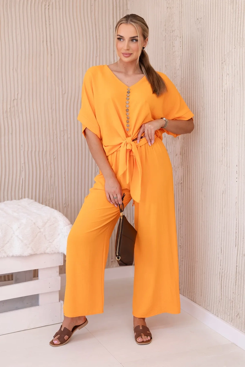 Komplet włoski z bluzką wiązaną z przodu i spodniami z szeroką nogawką to idealny wybór dla kobiet, które cenią sobie wygodę i styl w jednym. Bluzka zawiązywana z przodu na guziki, dodaje subtelnej kobiecości. Spodnie z szeroką nogawką, wykonane z przyjemnego w dotyku materiału, zapewniają swobodę ruchów i wygodę podczas noszenia. Taki kompletny zestaw można nosić na różne okazje - zarówno do pracy, jak i na randki czy spotkania ze znajomymi. Połączony z eleganckimi butami i dodatkami, takimi jak torebka czy biżuteria, stworzy stylową i modną stylizację. Rozmiar jest uniwersalny i będzie odpowiedni dla Pań w rozmiarze S, M lub L.