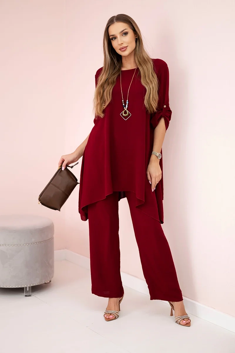 Ein italienisches zweiteiliges Set, bestehend aus einer ausgestellten Bluse und einer Hose, ist ein elegantes Set, das jedem Styling Charme und Stil verleiht. Eine ausgestellte Bluse verleiht dezente Weiblichkeit, betont die Figur und sorgt gleichzeitig für Bewegungsfreiheit. Durch den klassischen Schnitt der Hose passt sie perfekt zu einer eleganten Bluse und ergibt ein stimmiges und stilvolles Ganzes. Darüber hinaus ist der schlüsselförmige Anhänger ein charmantes Detail, das diesem Set Originalität und Charakter verleiht und eine harmonische Komposition schafft. Es handelt sich um ein elegantes Accessoire, das die Einzigartigkeit und Liebe zum Detail des gesamten Stylings unterstreicht. Dieses italienische Set eignet sich perfekt für viele Anlässe, vom Geschäftstreffen bis zum romantischen Date. Dies ist eine raffinierte Option für Menschen, die Eleganz und Komfort in einem schätzen. Die Größe ist universell und passt Frauen in den Größen S, M oder L.