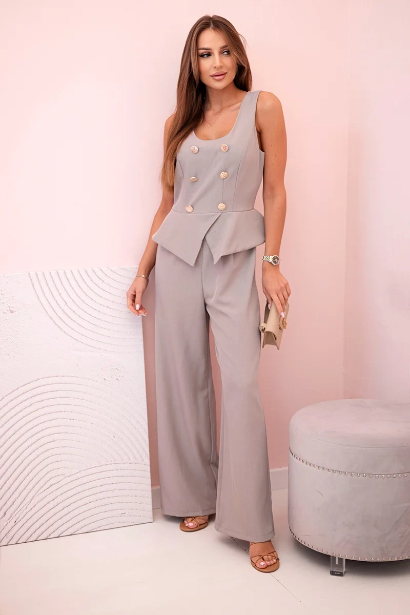 Ein stilvoller ärmelloser Damen-Jumpsuit ist die perfekte Wahl für jeden eleganten Anlass. Er besticht durch seinen originellen Schnitt mit dekorativen Knöpfen auf der Vorderseite und weiten Hosenbeinen, die der Silhouette Leichtigkeit und Bewegungsfreiheit verleihen. Das Oberteil ist mit Liebe zum Detail gestaltet – dekorative Klappen und eine Taillenbetonung unterstreichen die feminine Figur. Das Modell wird hinten mit einem Reißverschluss geschlossen und ist dadurch bequem anzuziehen. Dieser Jumpsuit ist ideal für wichtige Anlässe, Geschäftstreffen oder Abendessen – einfach elegante High Heels dazu und fertig! Das Material ist elastisch, glatt und sehr angenehm zu tragen. Die Größe ist universell und passt Damen mit Größe S, M oder L.