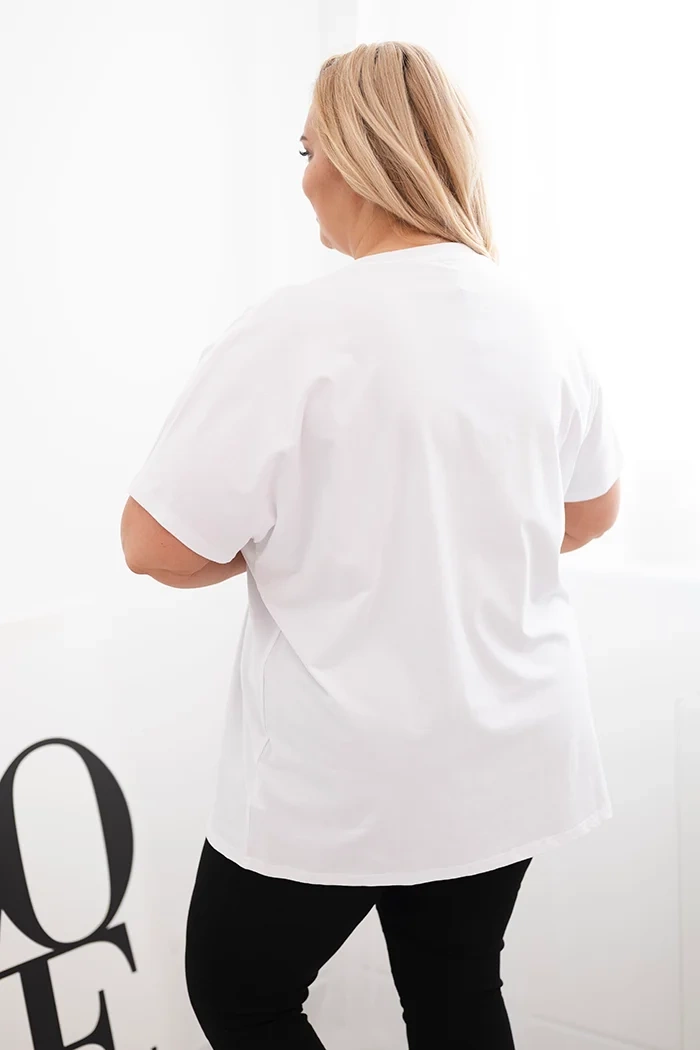Damenbluse mit kurzen Ärmeln und dekorativem Federmotiv – ideal für jede Jahreszeit. Ihr lockerer Schnitt garantiert Tragekomfort, und der auffällige Print mit glänzenden Elementen verleiht dem Outfit eine besondere Note. Perfekt sowohl für den Alltag als auch für lässigere Anlässe. Dank der weichen Baumwolle mit Elasthan ist der Stoff atmungsaktiv und elastisch, passt sich der Figur an, ohne einzuengen. Dekorative Federn und glitzernde Herzchen verleihen ihr femininen Charme, der garantiert Aufmerksamkeit erregt. Modell für Damen in Plus Size – XXL, XXXL und größer.