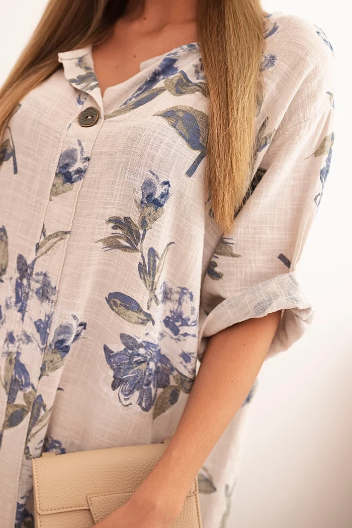 Damenkleid aus Baumwolle mit Blumenmuster und 3/4-Ärmeln beige