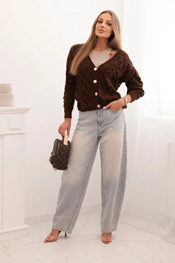 Dieser hübsche Damenpullover mit Ajourmuster ist die ideale Wahl für Frauen, die Eleganz und Komfort schätzen. Das Modell mit auffälligen goldenen Knöpfen und einem tiefen V-Ausschnitt verleiht ihm einen dezenten Charme und eine feminine Note. Der lockere Schnitt sorgt dafür, dass der Pullover gut am Körper liegt, ohne die Bewegungsfreiheit einzuschränken, und passt sowohl zu Jeans als auch zu Röcken. Der Pullover ist perfekt für kühlere Tage – tragbar zur Arbeit, beim Spaziergang, Treffen mit Freunden oder als Teil eines lässigen Outfits. Das leichte und luftige Ajourmaterial bietet den ganzen Tag über Komfort. Die Größe ist universell und geeignet für Damen in den Größen S, M oder L.