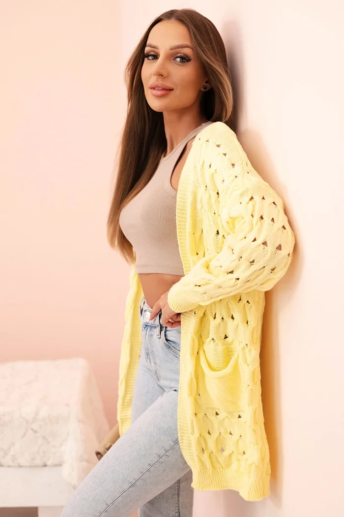 Dieser Damen-Strickcardigan ist eine hervorragende Wahl für Frauen, die Komfort, Stil und ein originelles Aussehen schätzen. Hergestellt aus weichem, angenehm zu tragendem Material, zeichnet er sich durch ein modisches, luftiges Strickmuster aus, das ihm Leichtigkeit und feminine Anmut verleiht. Der längere Schnitt passt sowohl zu Leggings als auch zu engen Jeans. Der Cardigan verfügt über praktische Taschen vorne, die ihm Funktionalität verleihen, und das Fehlen eines Verschlusses unterstreicht seinen lässigen, entspannten Stil. Ideal für kühlere Tage im Frühling und Sommer, eignet er sich auch als stilvolles Accessoire für das Büro oder für Spaziergänge. Die Größe ist universell und eignet sich für Damen in den Größen S, M oder L.