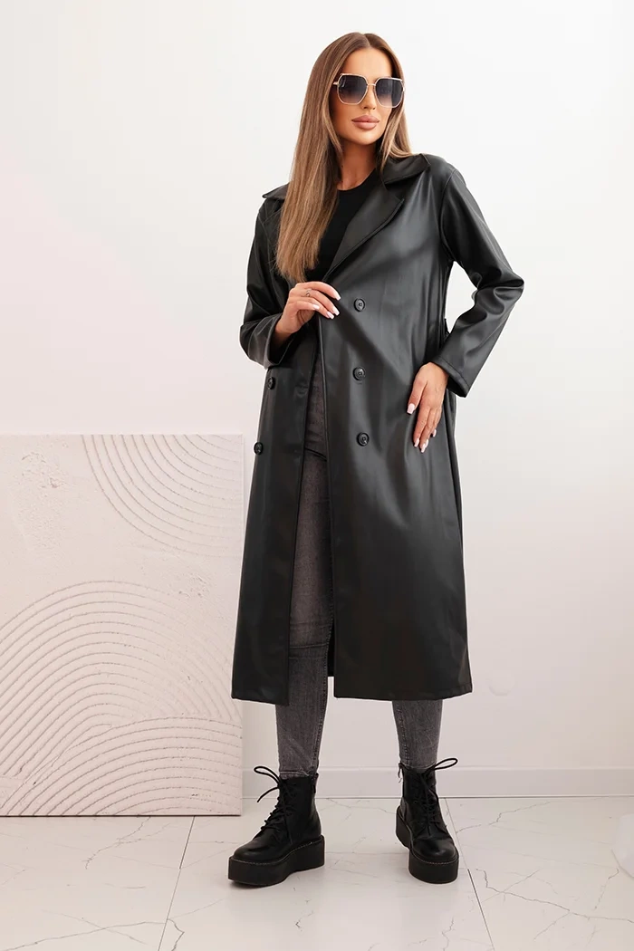 Damen-Trenchcoat aus Kunstleder mit Gürtel und Kragen schwarz