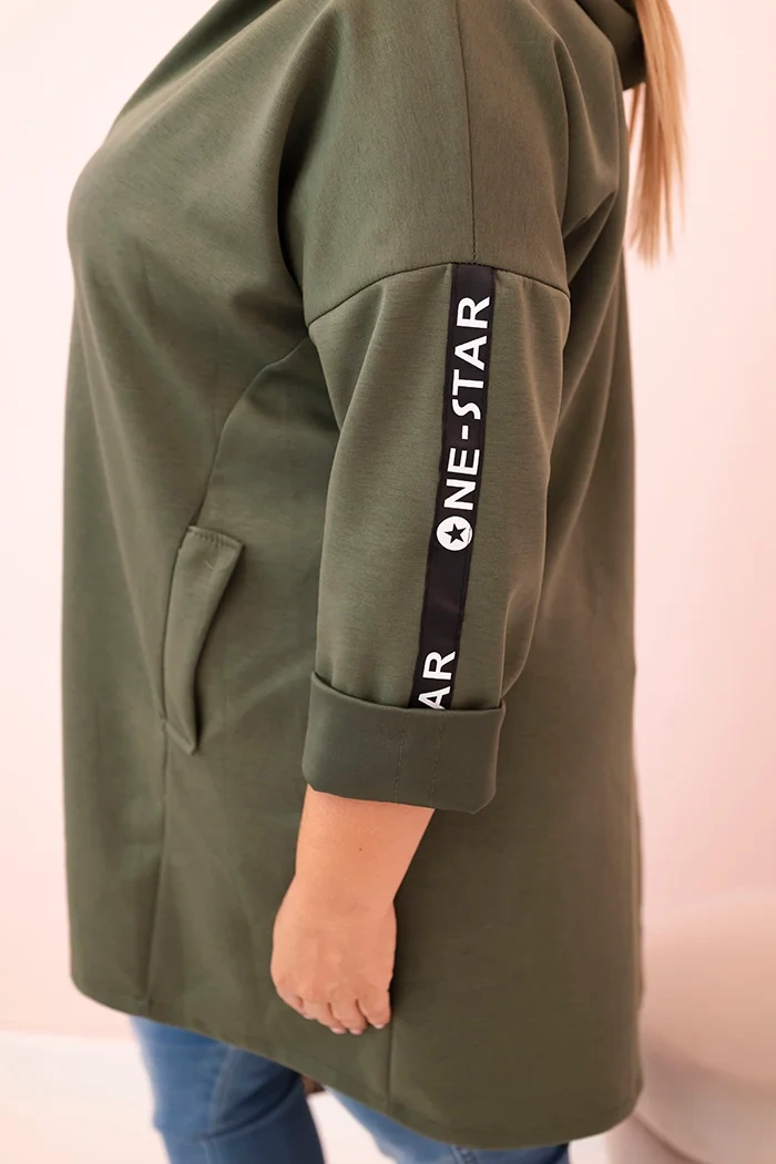Dieser Damen-Pullover in Übergrößen ist die perfekte Wahl für Frauen, die Komfort und einen modischen, lässigen Stil schätzen. Hergestellt aus einer weichen Mischung aus Polyester, Viskose und Elasthan, passt er sich hervorragend an die Figur an und schränkt die Bewegungen nicht ein. Das Modell mit einem Reißverschluss und einem dekorativen Ring am Zipper verleiht einen modernen Charakter, während die Kapuze die Funktionalität erhöht. Am Ärmel befindet sich ein modischer Druck im Streetwear-Stil, der ins Auge fällt und den sportlichen Stil des Pullovers unterstreicht.