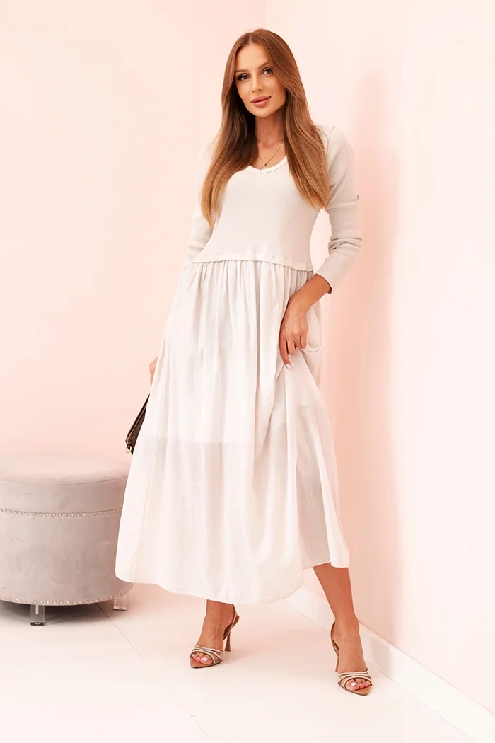 Luftiges Damenkleid aus angenehm weichem Baumwolljersey, das sich schön an die Silhouette anschmiegt. Der Oberteil aus geripptem Material betont die weibliche Linie, während der untere Teil mit leicht gerafftem Saum Leichtigkeit verleiht. Der tiefe V-Ausschnitt lässt den Hals optisch schlanker erscheinen, und die langen Ärmel sorgen für Komfort an kühleren Tagen.