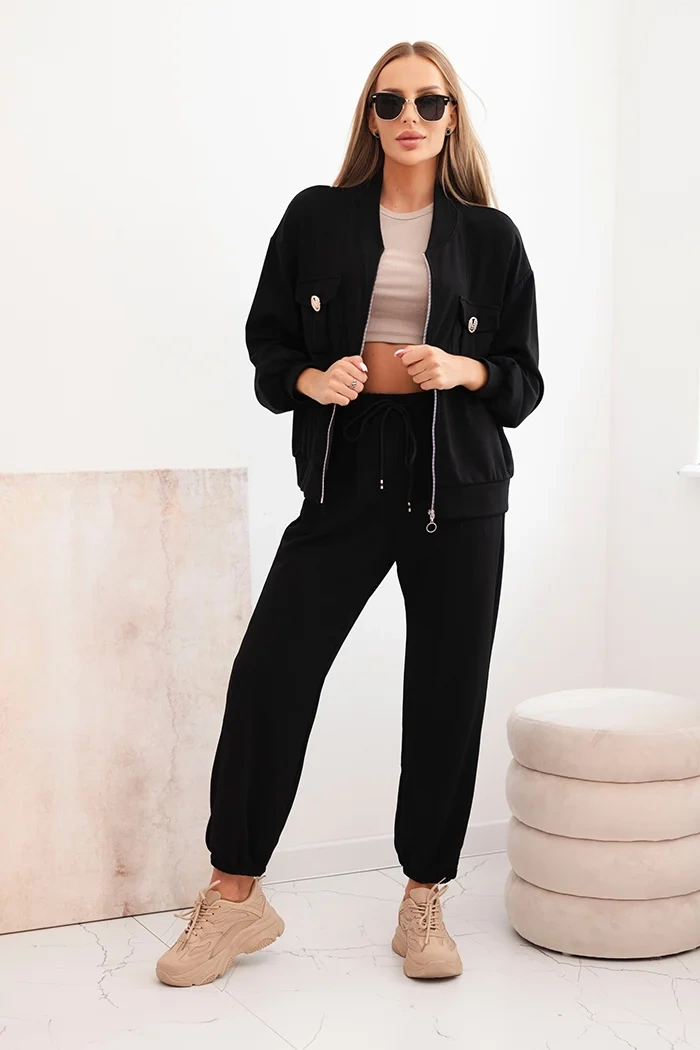 Eleganter und bequemer Damenanzug in Buttercreme-Optik, entworfen für Komfort und modischen Stil. Er besteht aus einer offenen Jacke mit auffälligen Taschen, die mit dekorativen Knöpfen versehen sind, und einer Hose mit elastischem Bund und Kordelzug, die eine perfekte Passform gewährleisten. Hergestellt aus hochwertiger Viskose mit Polyester- und Elasthananteil, ist er weich, angenehm zu berühren und passt sich hervorragend der Silhouette an.