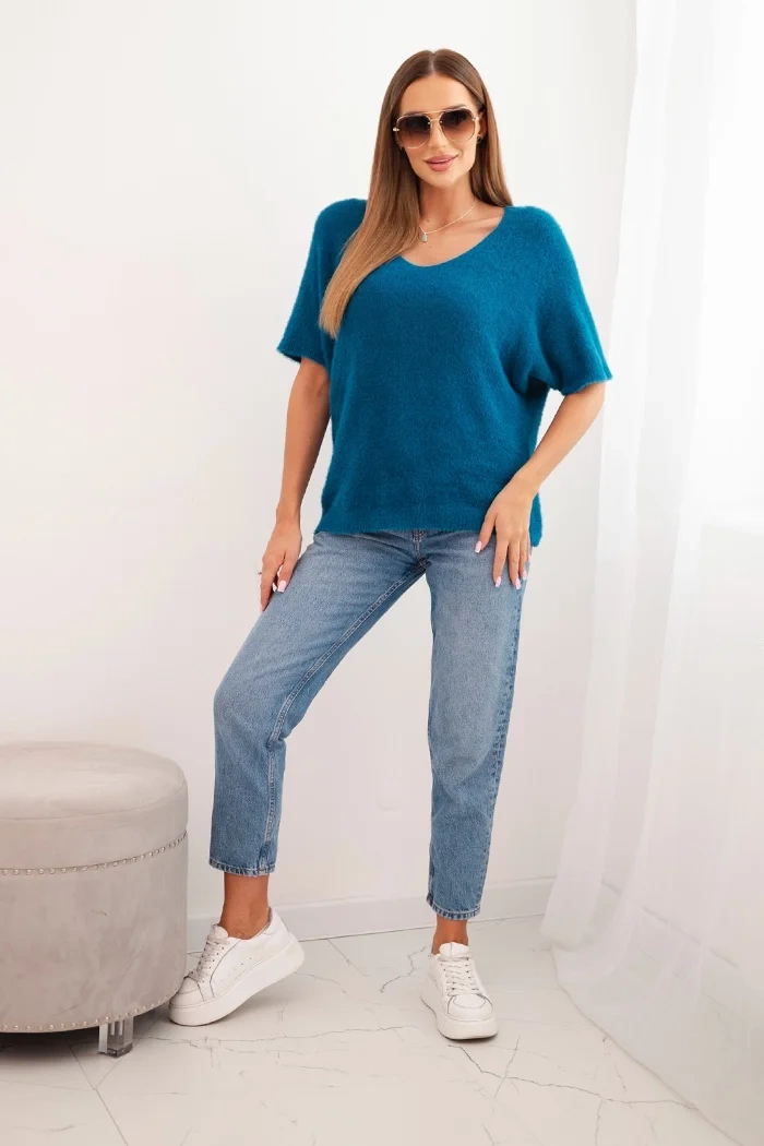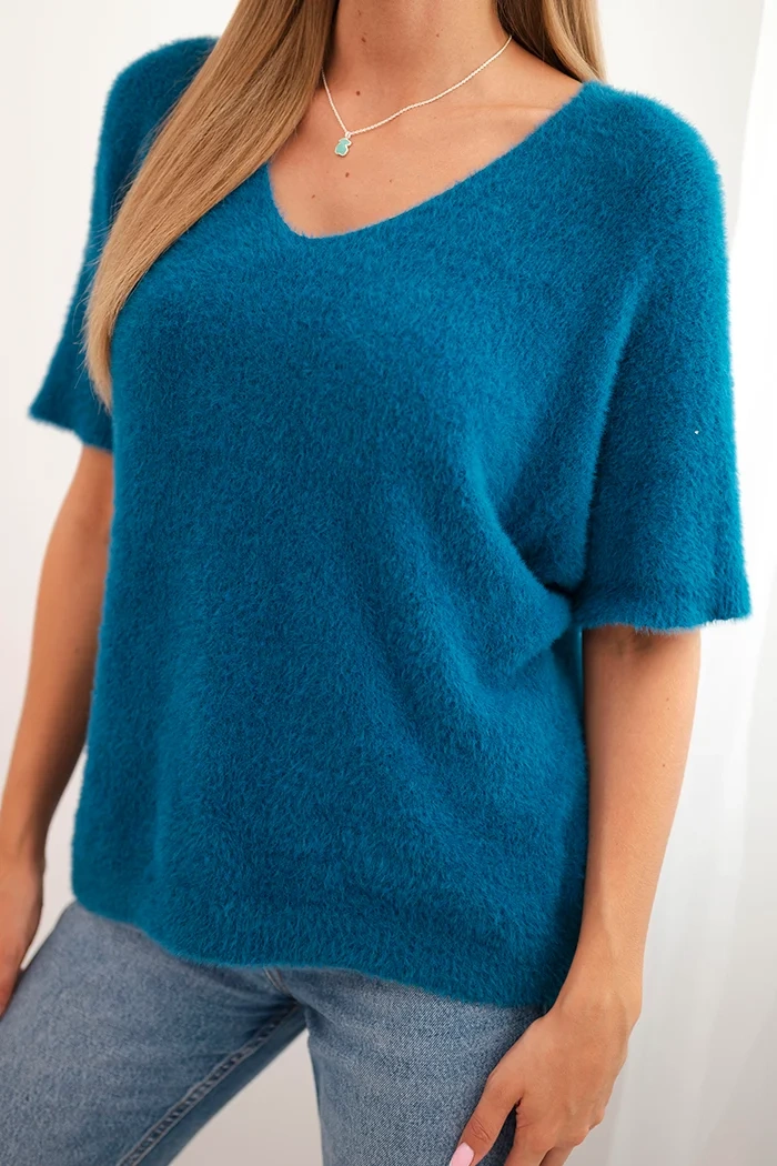 Damenpullover aus weichem Fleece mit V-Ausschnitt und kurzen Ärmeln in Meeresfarbe