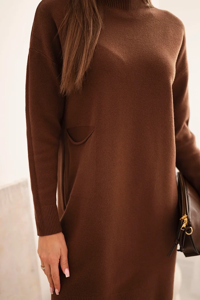 Damenstrickkleid mit Rollkragen und Tasche braun