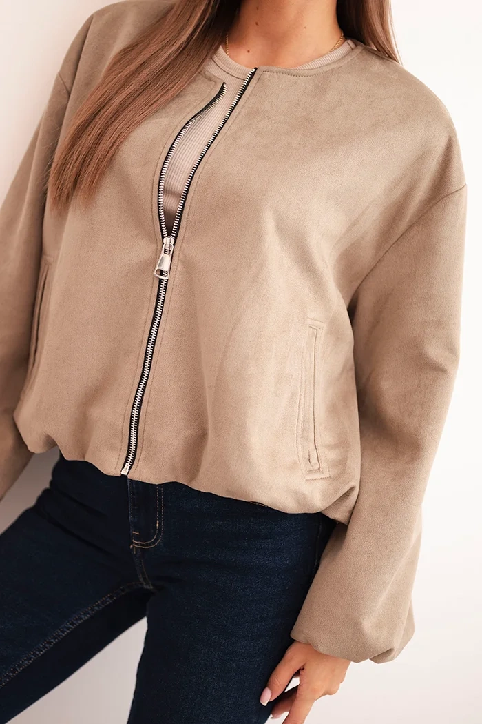 Stylische Damenjacke im lässigen Schnitt ist die perfekte Wahl für Übergangstage, wenn Ihnen Komfort und ein modisches Aussehen wichtig sind. Hergestellt aus weichem Material mit einem Anteil an Elasthan, passt sie sich ideal an die Silhouette an und bietet Bewegungsfreiheit und Tragekomfort. Die Jacke ist mit einem Reißverschluss ausgestattet, hat einen eleganten runden Ausschnitt und leicht puffige Ärmel, die sich sowohl für alltägliche als auch für lässigere Stylings hervorragend eignen.