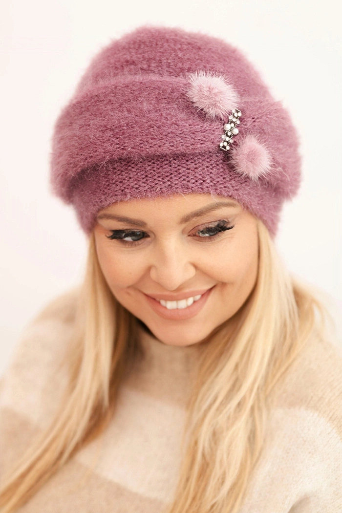 Die Mütze ist mit einem eleganten dekorativen Element aus glänzenden Steinen und zarten, pelzigen Kugeln verziert, die ihr Charme und modischen Charakter verleihen.