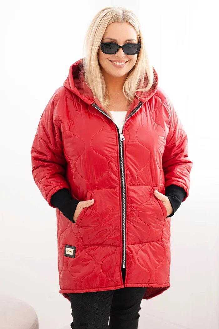 Warme und stilvolle Damenjacke in Plus Size mit modernem, asymmetrischem Schnitt und verlängertem Rücken. Modell aus gestepptem Material, ideal für kühlere Tage. Verfügt über eine praktische Kapuze, einen Reißverschluss und bequeme Bündchen an den Ärmeln. Eignet sich hervorragend für alltägliche Stylings – sowohl zu Hosen als auch zu Leggings.