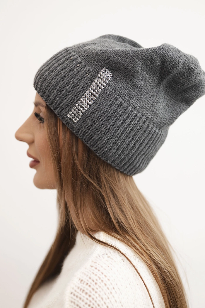 Modische Damenmütze aus elastischem Strickstoff mit glänzenden Strasssteinen an den Seiten. Ideal für den Winter – kombiniert Komfort, Wärme und modernes Aussehen. Dank ihrer Elastizität passt sie sich der Kopfform an und sorgt für ein angenehmes Tragegefühl.