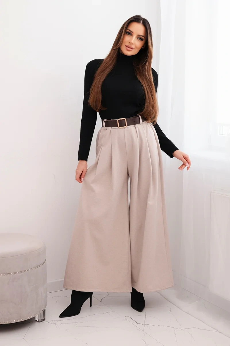 Ein zusätzlicher Vorteil ist der breite Gürtel mit Schnalle im Set, der die Taille betont und der Garderobe einen modischen Akzent verleiht. Die Hose verfügt über elegante Falten an der Vorderseite, was ihr ein ausgefeilteres Aussehen verleiht – sie eignet sich sowohl für den Alltag als auch für die Arbeit oder Geschäftstreffen.