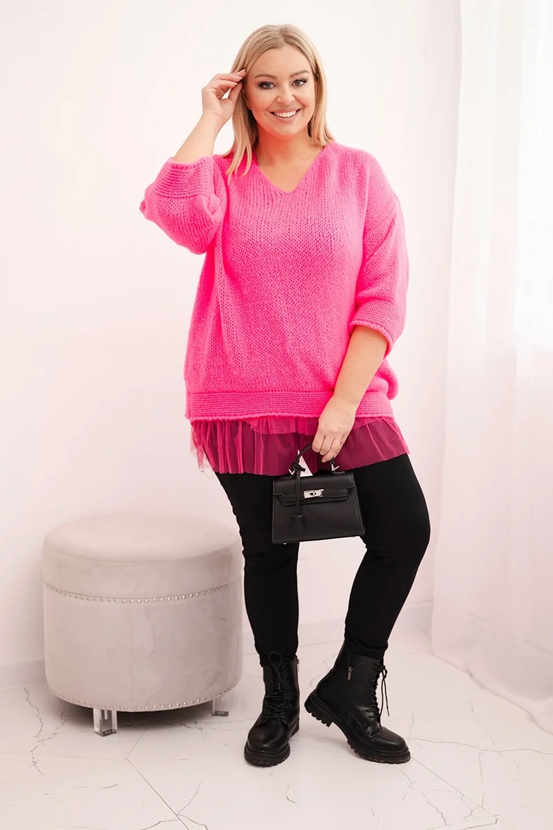 Damen Komplettset mit V-Ausschnitt Pullover und Viskosebluse mit Spitzenboden neonrosa