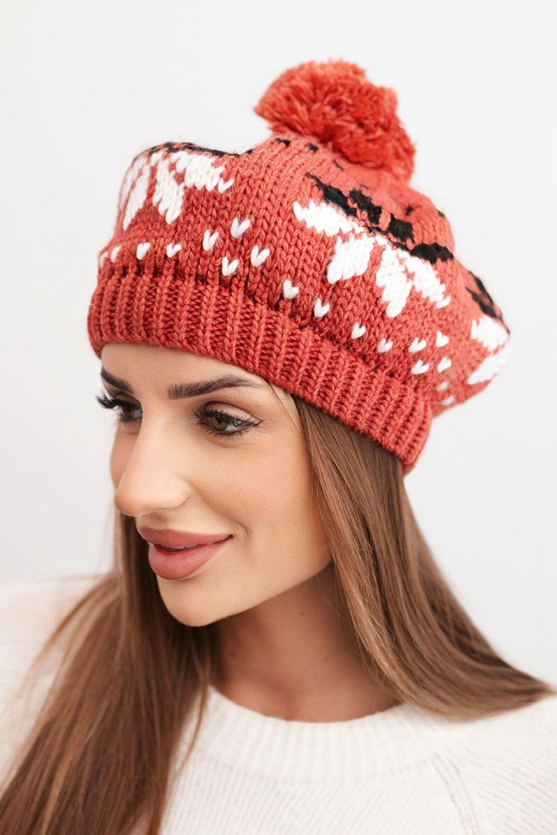 Damenwintermütze aus Wolle mit Schneeflockenmuster und Pompom K457 rot