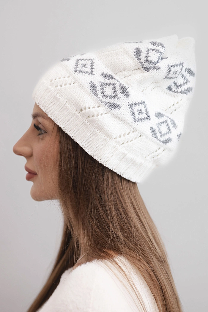 Damen Wintermütze aus Wolle mit geometrischem Muster K434 weiß + grau