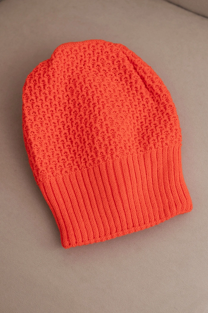 Modische und bequeme Damenmütze im klassischen Schnitt mit zartem Muster im oberen Bereich und breitem, doppeltem Bund, der eine hervorragende Anpassung an den Kopf und zusätzlichen Schutz vor Kälte bietet. Hergestellt aus hochwertigem Garn mit einem Anteil an natürlicher Wolle, ideal für winterliche Tage.