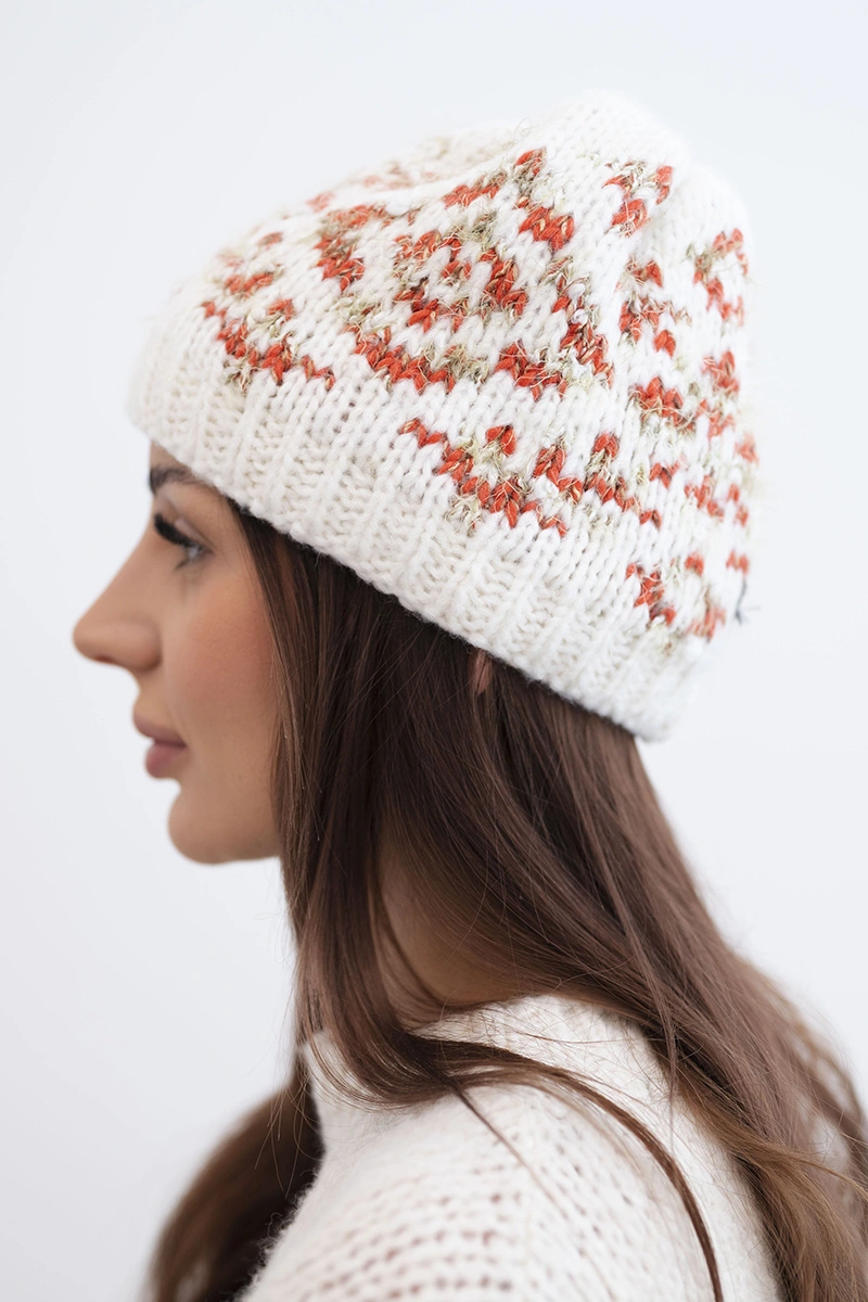 Damen Wintermütze mit bunten Mustern und dickem Bündchen K353 weiß+orange