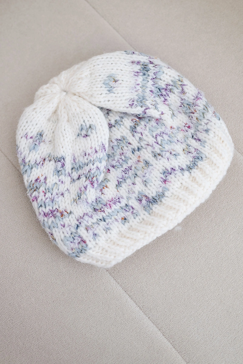 Damenmütze aus Wolle mit norwegischem Muster K354 ecru+lila