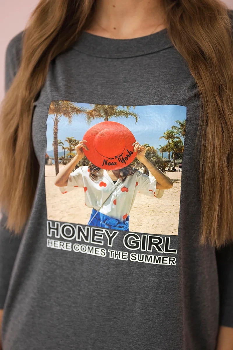 Grafito spalvos suknelė su medaus mergaitės piešiniu
