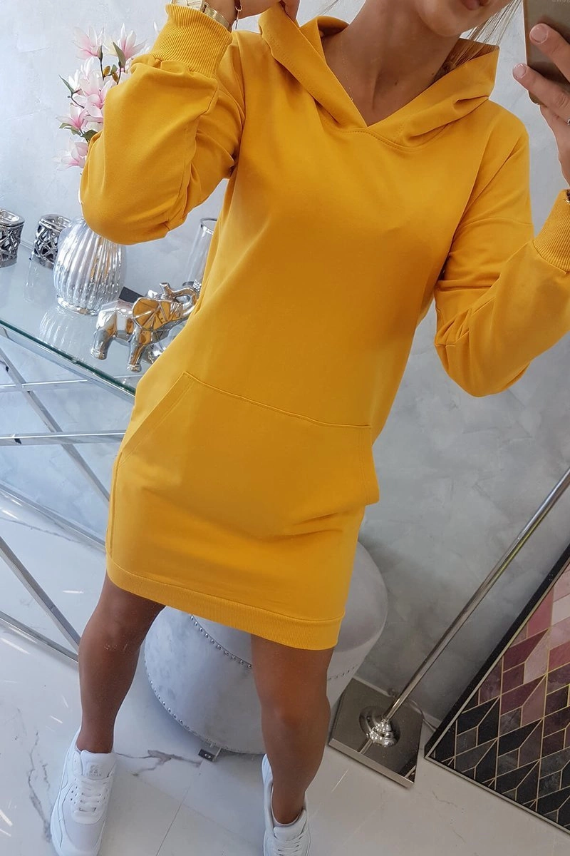 Pristatome jums patogią suknelę. Suknelė su gobtuvu ir kengūros kišene. Suknelė nėra marginta, todėl tiks prie įvairių drabužių. Suknelė pagaminta iš aukštos kokybės medžiagos. Dydis yra universalus ir tiks moterims, nešiojančioms S, M arba L dydžio drabužius.